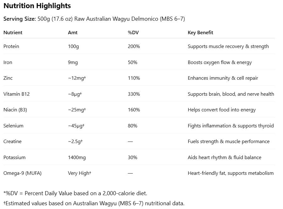 - Australian Wagyu Delmonico: Enjoy the premium taste of our Australian Wagyu Delmonico steak.